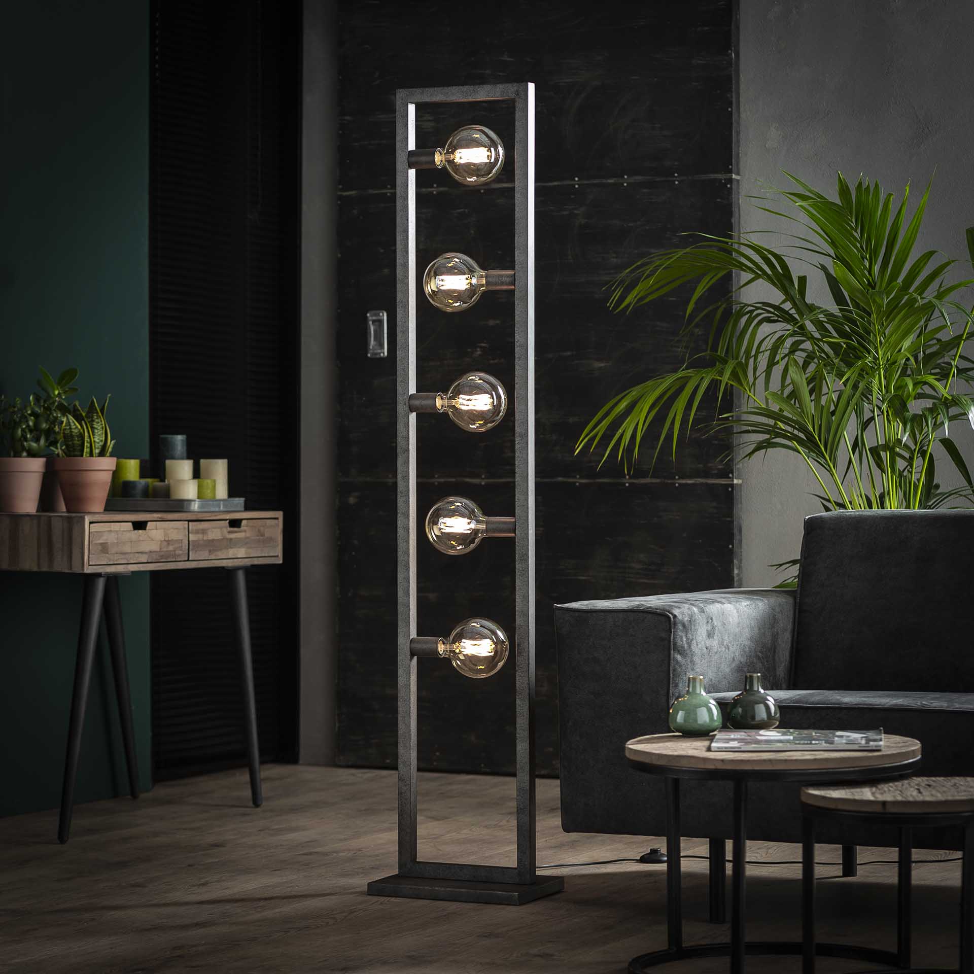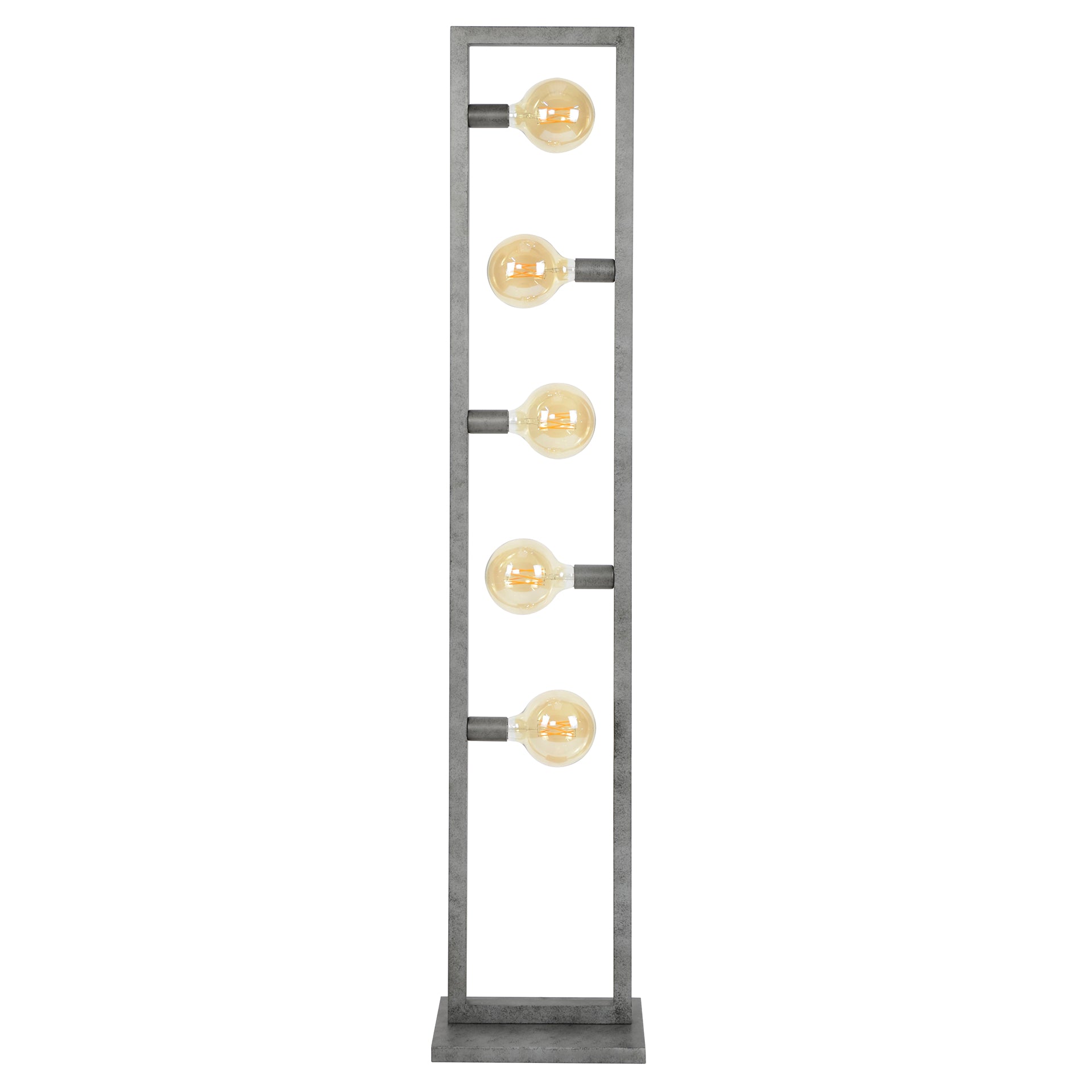 Rektangulær gulvampe i patineret stil med 5 pærer. Ledninger er indbygget i lampen. Vi anbefaler vores pære 8467 til at give det rette bløde lys der passer til denne vintage gulvlampe.