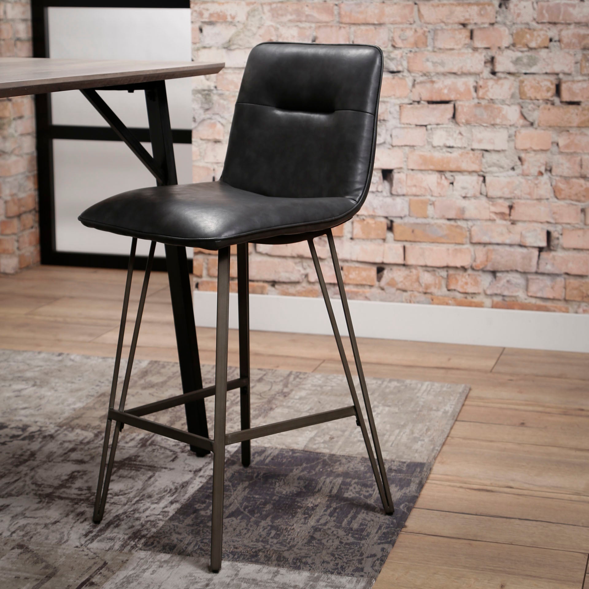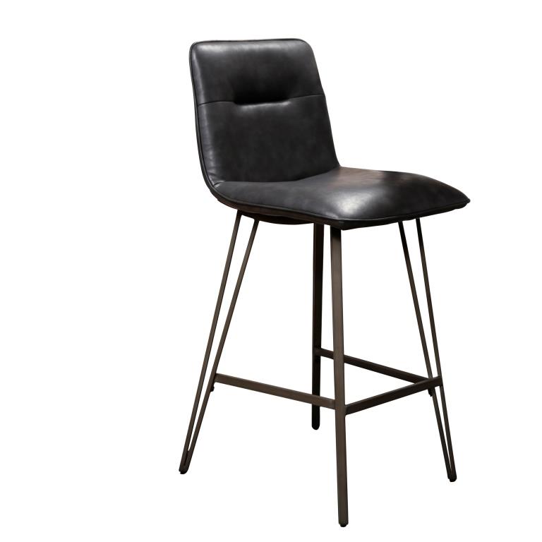 Barstol i metal med V-ben og sæde i blødt patineret sort PU læder.