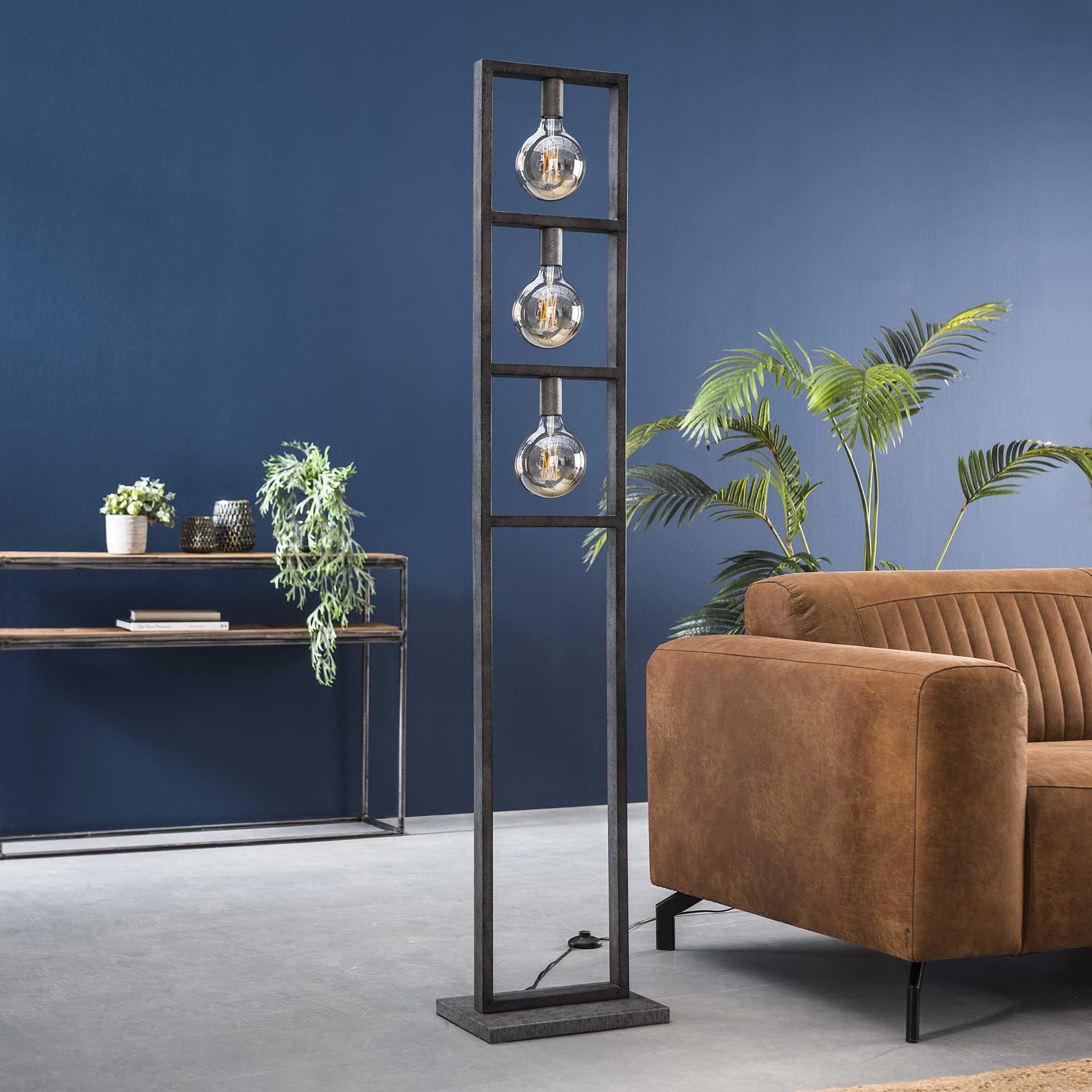 Unik gulvlampe i et spændende og unik design, hvor både soklen og den spiralformede top bidrager til designet. Unik Lampe i en åben ramme stil, med de 3 pærer helt i fokus. Finish på lampen er patineret og højden er 165 cm.