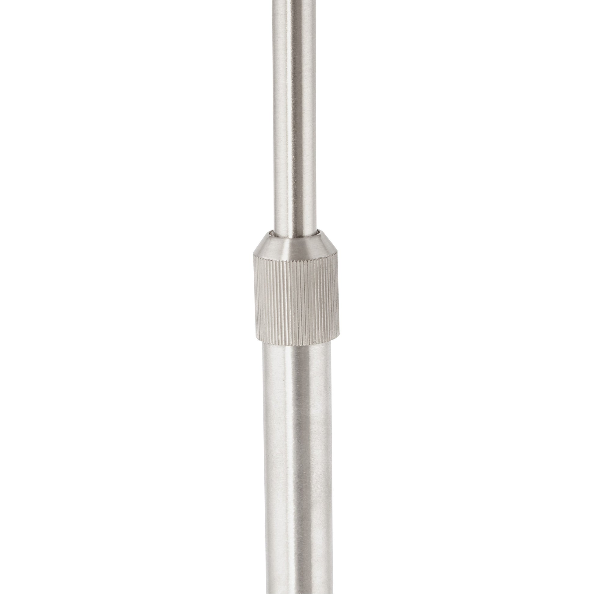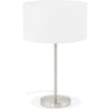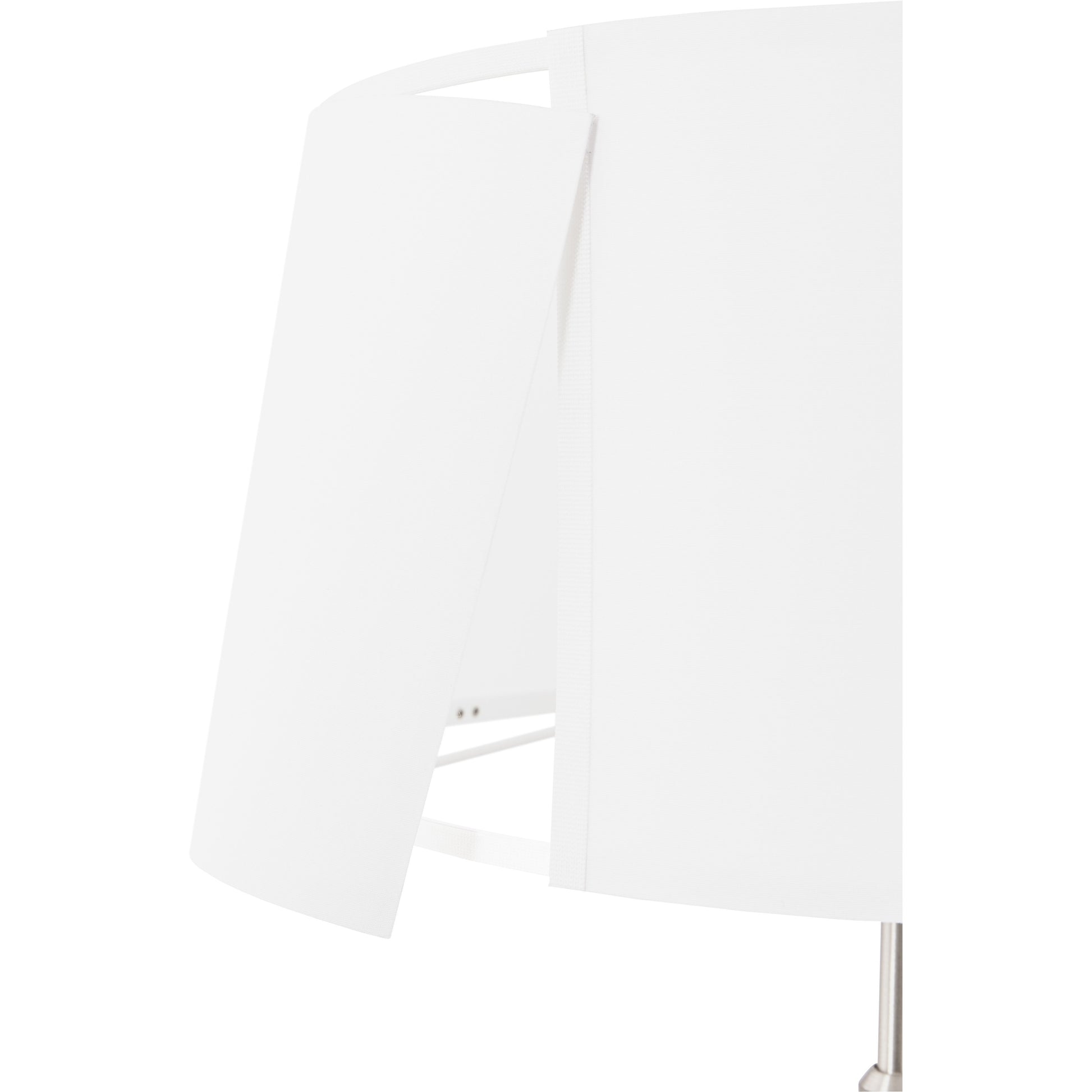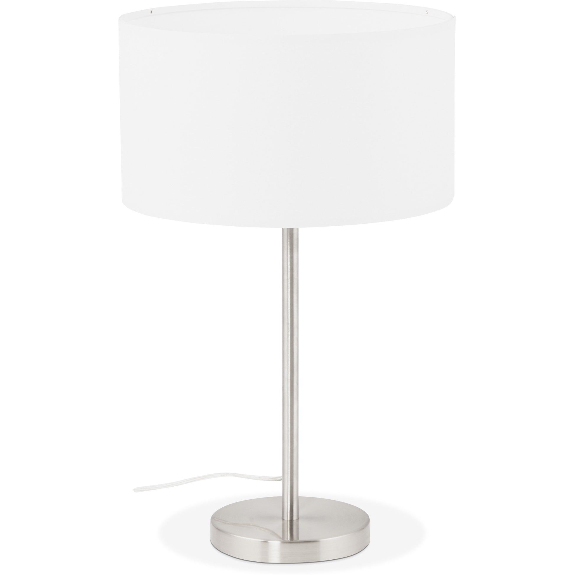 Design hvid lounge lampe med stofskærm og fod i børstet metal: