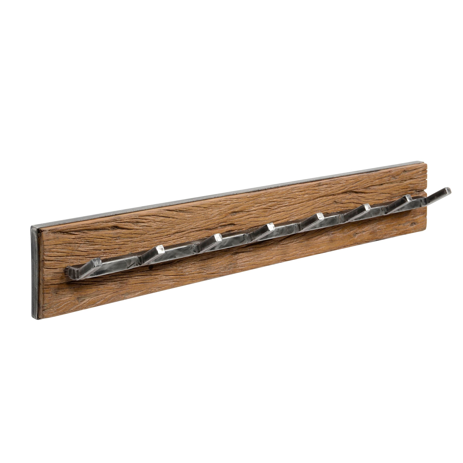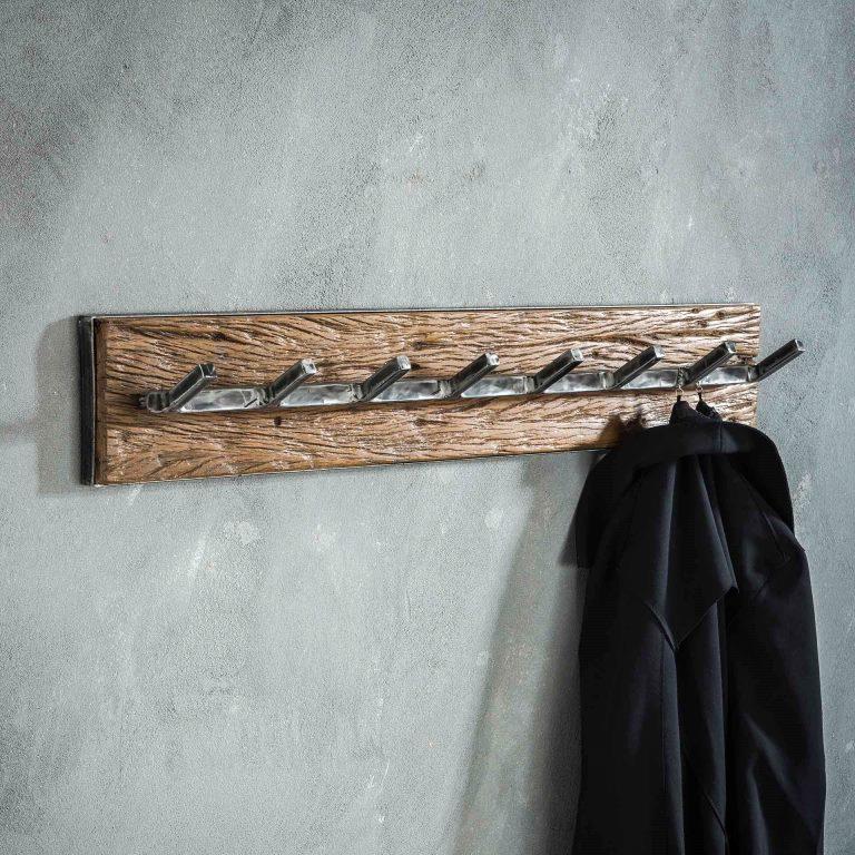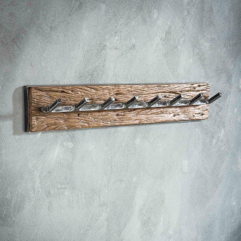 Klassisk knagerække udført i tidens trendy materialer, genbrugstræ og otte knager patineret sort metal. Træet er genbrug fra bl.a. nedrivningshuse og derfor er der ikke to knagerækker der er helt ens.