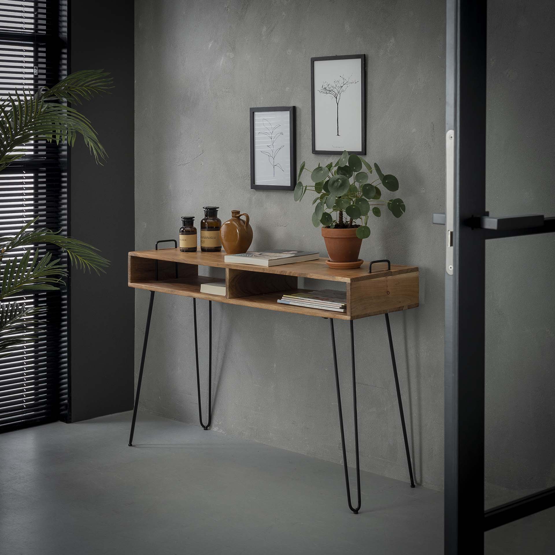 Spændende konsolbord med to åbne rum der hver måler 55 cm x 35 cm x højde 10 cm. Masser af plads til opbevaring uanset om bordet bruges i dagligstuen, spisestuen eller entreen.