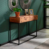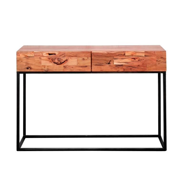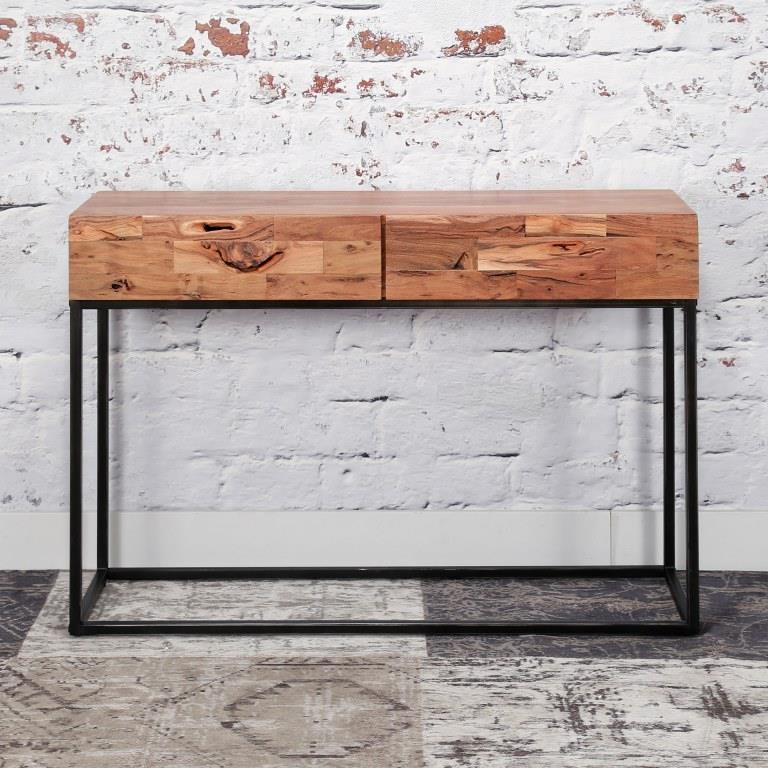 Flot og anderledes konsolbord i massiv sandbæst akacietræ med to skuffer til opbevaring.