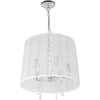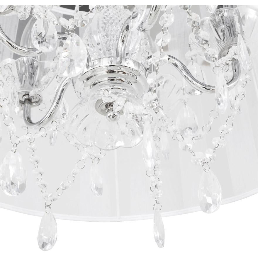 Lysekronen er i stål med krystaller under en elegant hvid stofskærm.