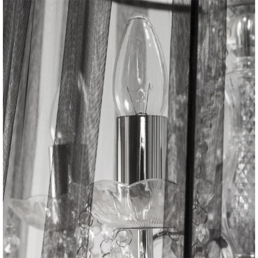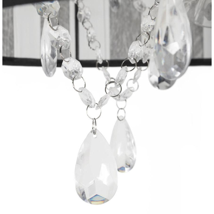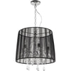 Lysekronen er i stål med krystaller under en elegant sort stofskærm.
