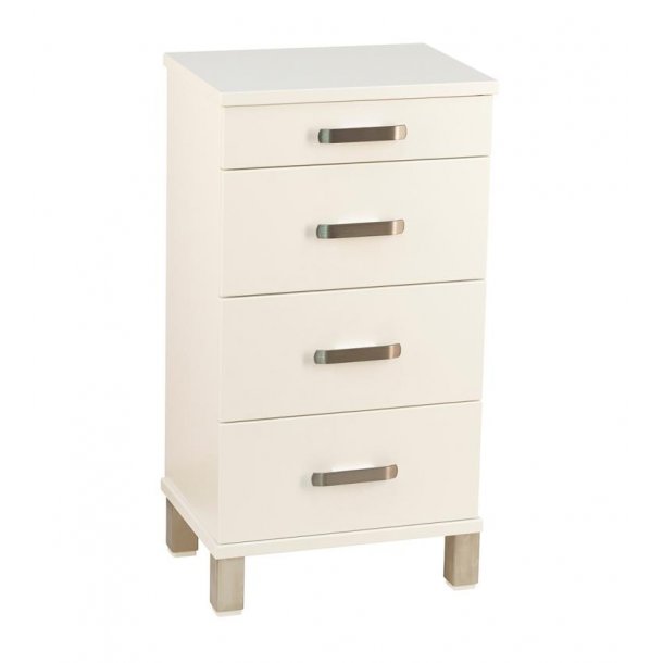 Her sælges en kommode med 4 skuffer og metalben, 40 cm bred, 31 cm dyb og 75 cm i højden. Kommoden leveres færdigsamlet, benene skal blot skrues på.