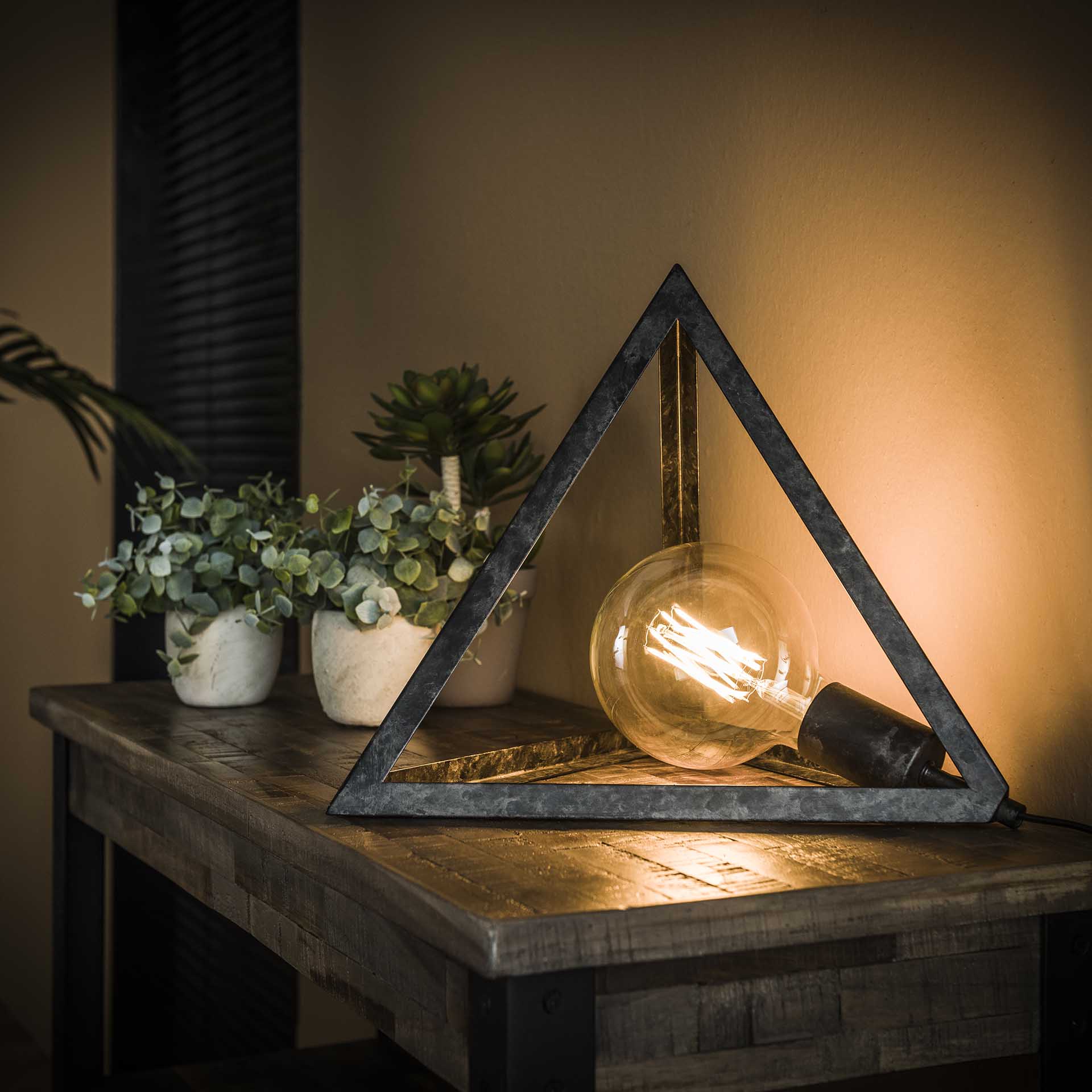 Bordlampe designet i pyramideform med en finish i patineret sort metal.