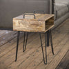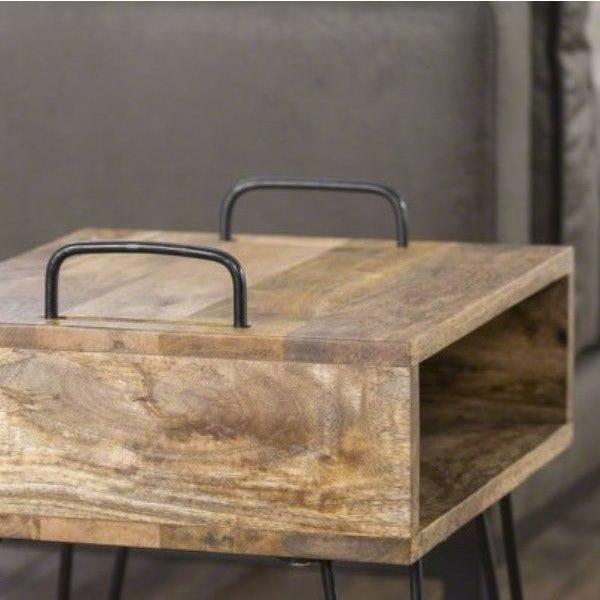 Sofabord med håndtag og ben i sort metal. Flot designet sofabord med den smarte håndtags detalje, der både giver bordet et unikt udseende samtidig med at det gør det let at flytte. Stilen er rustik og bordet vil fremstå sådan. Der er ikke 2 borde der er ens - lutter unikke møbler.