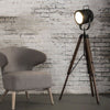 Flot standerlampe i sort metal og patineret mørkt træ.