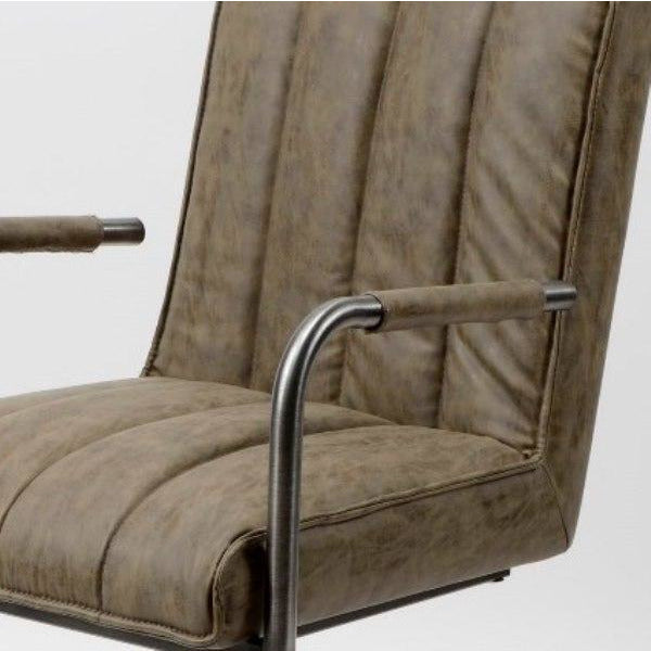 Stolen har blødt gråbrun PU læder med dobbelt syninger. Armlæn for god sidde komfort, ekstra bredde og trendy moderne stel i stål.