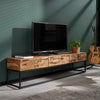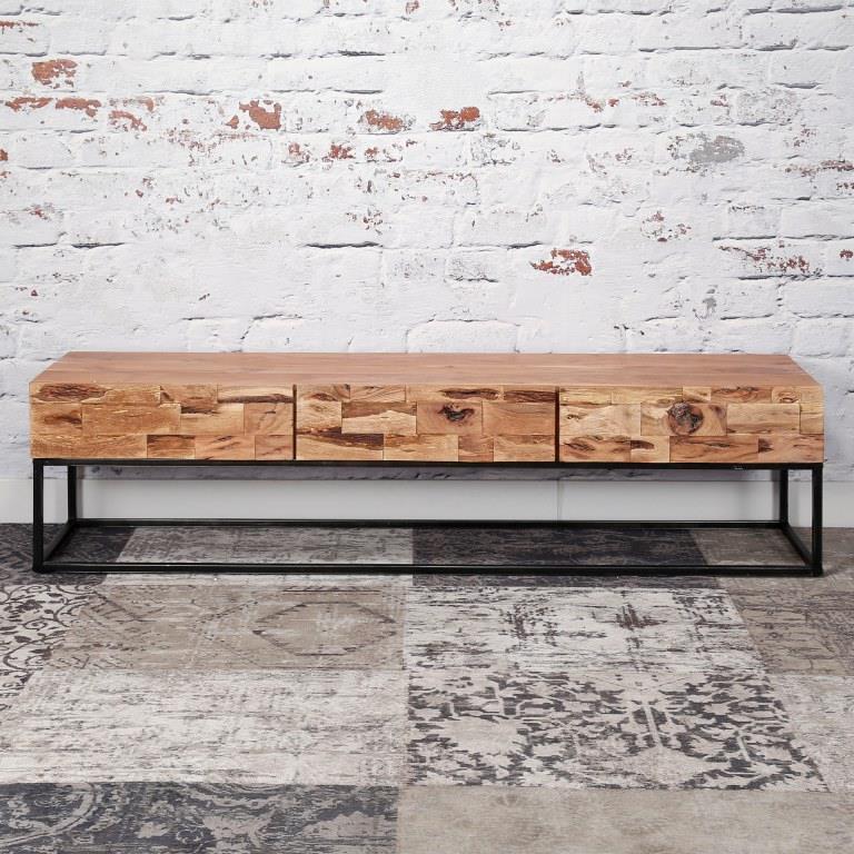 TV bord udført i massiv sandblæst akcietræ på en sort kubistisk metal fod. TV bordet har 3 skuffer.