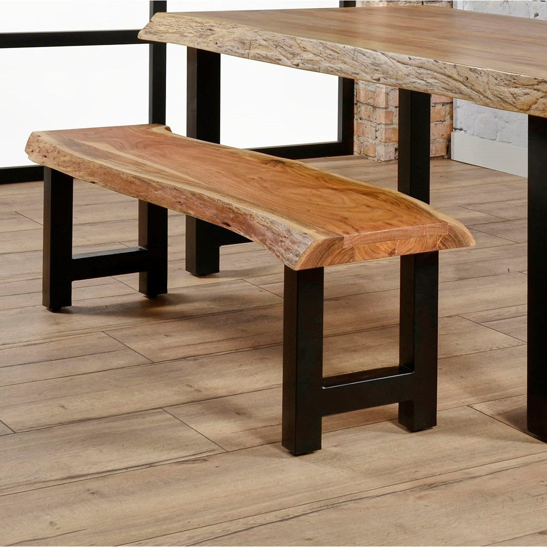 Robust og kraftigt bænk i 8 cm. massiv natur lakeret akacietræ med bølget naturkant. I denne serie findes der ikke 2 bænke der er ens, alle er unikke.