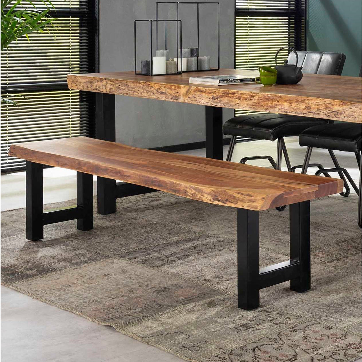Robust og kraftigt bænk i 6 cm. massiv natur lakeret akacietræ med bølget naturkant. I denne serie findes der ikke 2 bænke der er ens, alle er unikke.